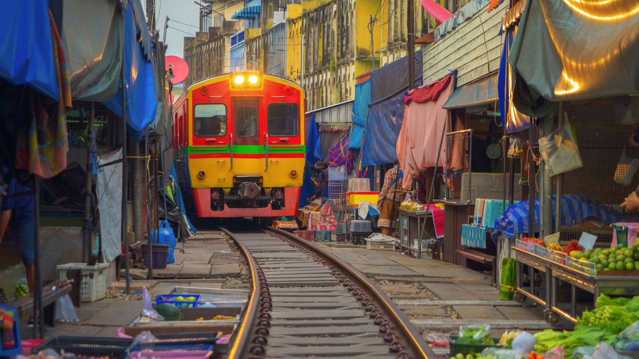 Plus qu’un voyage, c’est un spectacle. Ce train local traverse littéralement un marché actif à Samut Songkhram.